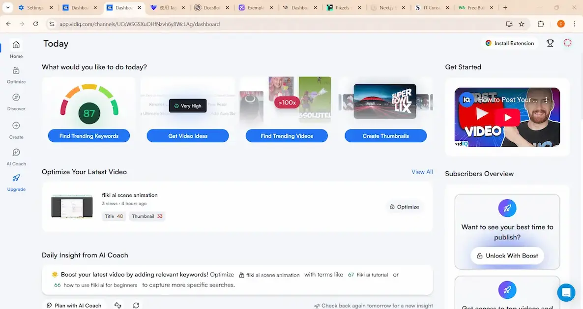 vidIQ → I research keywords, find video ideas, and analyze competitors to increase views.