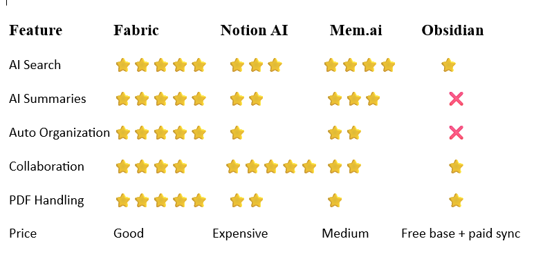 Conclusion:Fabric is the strongest tool if you want AI + knowledge management + collaboration in one place.