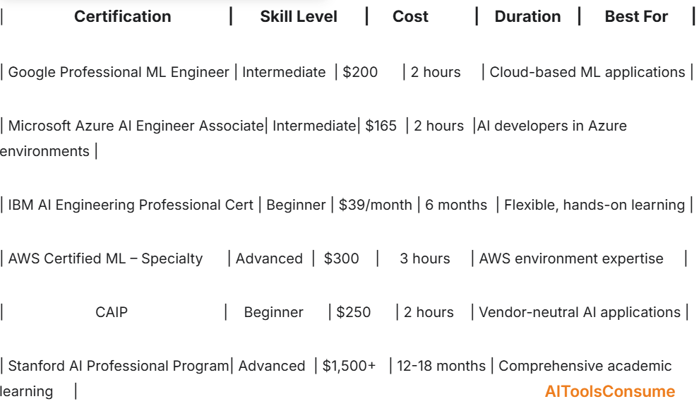 | Google Professional ML Engineer | Intermediate | $200 | 2 hours | Cloud-based ML applications |